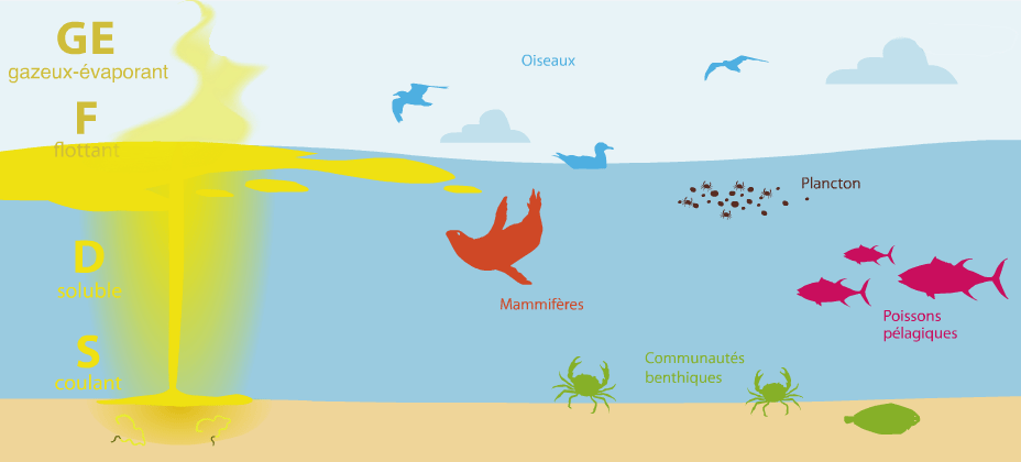 Le comportement d’une substance chimique dans l’eau influence fortement son devenir dans l’environnement marin au cours des jours, des mois et des années qui suivent son déversement. Dans la plupart des cas, une substance n’a pas un mais plusieurs comportements.