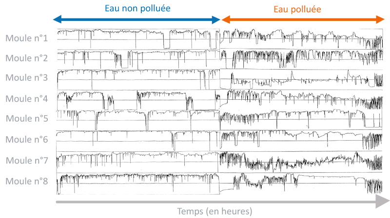 Le Mosselmonitor© a été conçu par une équipe de chercheurs néerlandais. Ce dispositif expérimental permet de détecter une pollution aquatique en utilisant des moules comme bio-indicateurs. En temps normal, ces dernières s’ouvrent pour filtrer l’eau. Lorsqu’elles se retrouvent dans un environnement pollué, elles se referment mais entrouvrent très fréquemment leurs coquilles afin de « goûter » le milieu ambiant et de déterminer si la pollution est toujours présente.